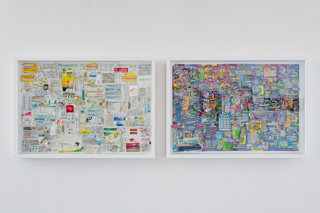 Diptyque, 2 vitrines 90 x 70 x 5 cm, emballages de médicaments, jeux à gratter perdants.